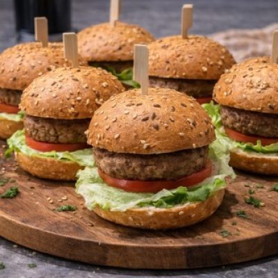 Een mini brioche broodje belegd met sla, tomaat, rode ui,...