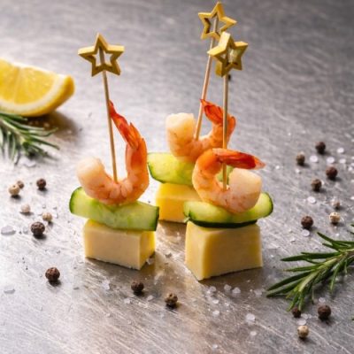Prikker met een blokje kaas, rolletje komkommer en een garnaal...
