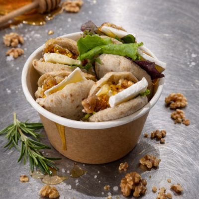 Mini pita broodje gevuld met brie, rucola, walnoot en honing...