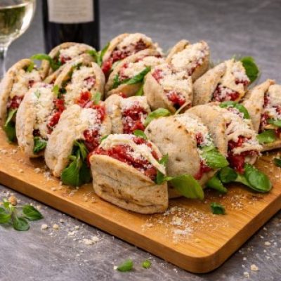 Mini pita broodje gevuld met carpaccio, parmezaan, rucola en truffelmayonaise...