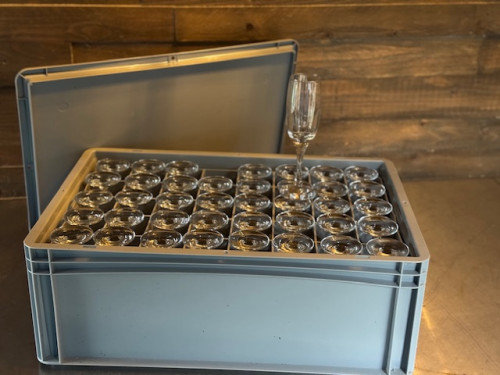 Champagne flute, per krat á 40 stuks. Glaswerk dient schoon en breukvrij retour gedaan te worden. Bij breuk wordt er €2,00 per glas in rekening gebracht.