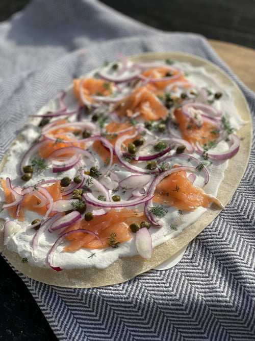Flammkuchen met crème fraiche, rode ui, gerookte zalm, kappertjes en dille.