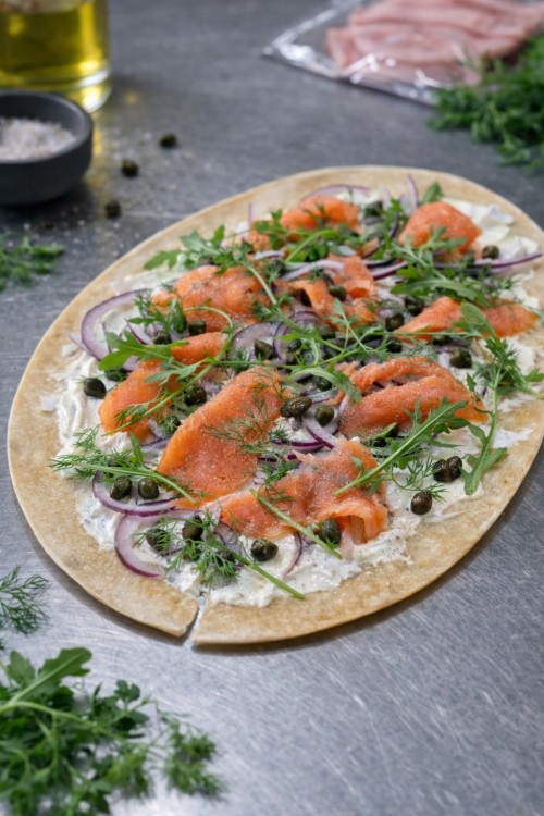 Flammkuchen met crème fraiche, rode ui, gerookte zalm, kappertjes, dille en rucola