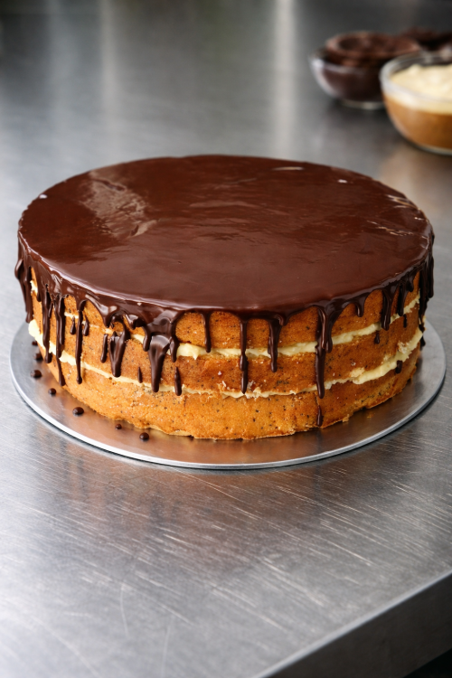 Biscuit taart gevuld met banketbakkersroom, lemon curd en maanzaad.