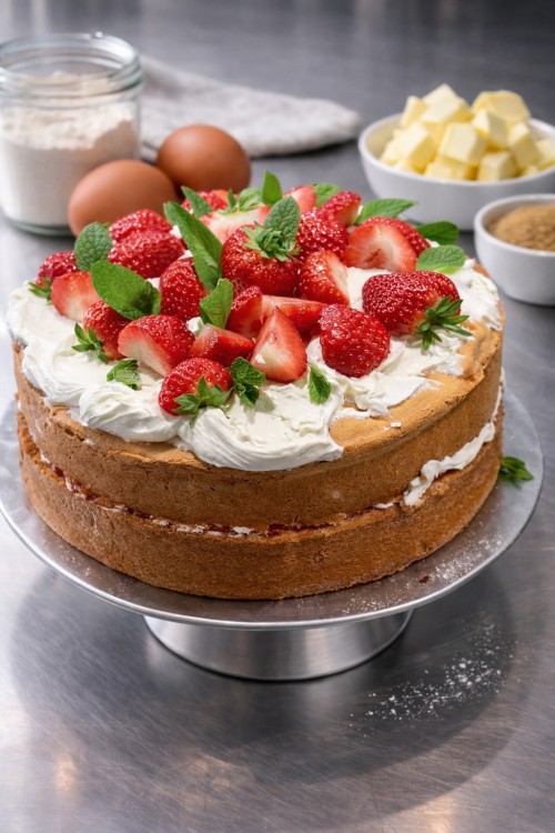 Biscuit taart met mascarponecreme, aardbeien en munt. Indien aardbeien voorradig zijn.