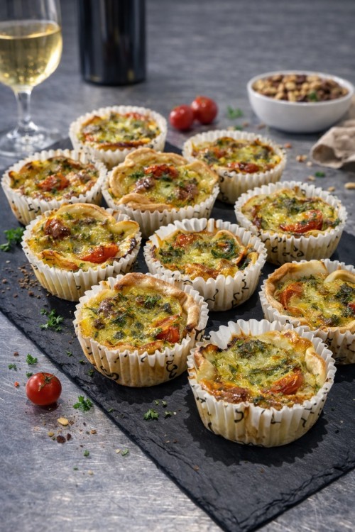 Mini quiche gevuld met mozzarella, tomaat, pesto en kaas.