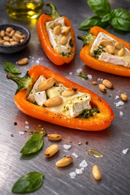 Halve mini paprika gevuld met brie en pesto.