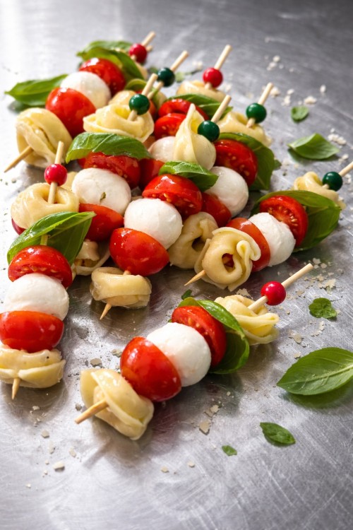 Prikker met gevulde pasta, tomaatje, mozzarella en basilicum.