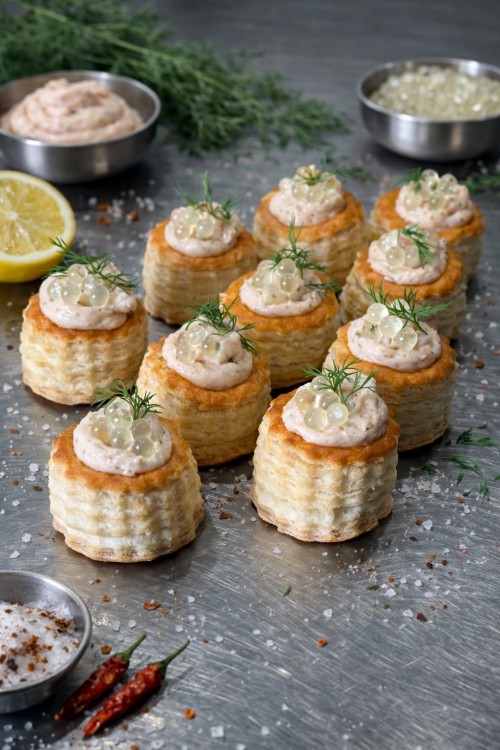 Pasteitje gevuld met zalmmousse. Geleverde kan enigszins afwijkend zijn dan op de foto.
