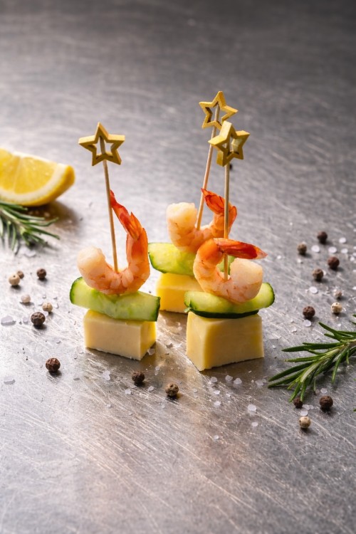 Prikker met een blokje kaas, rolletje komkommer en een garnaal