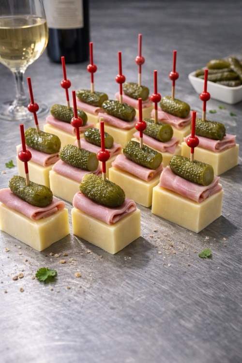 Prikker met een blokje kaas, rolletje ham en een augurkje