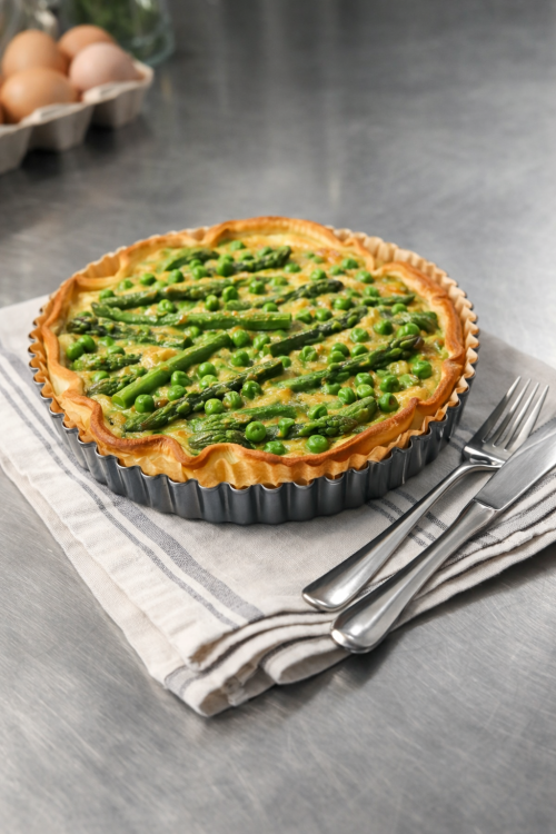 Quiche gevuld met groene asperges, doperwtjes en geraspte kaas