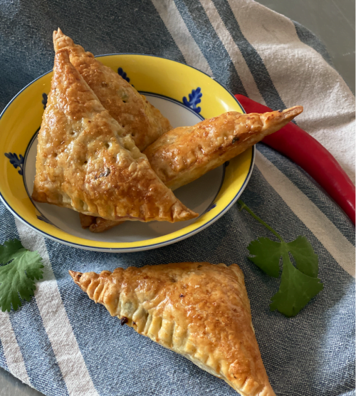 Hét Indiase bladerdeeg hapje samosa met groene erwten en aardappel. Bomvol met smaken en licht spicy. 4 stuks.