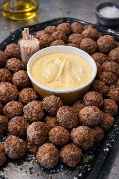 Gehakt gekruid met Smokey kruiden en geserveerd met een mayonaise dip.