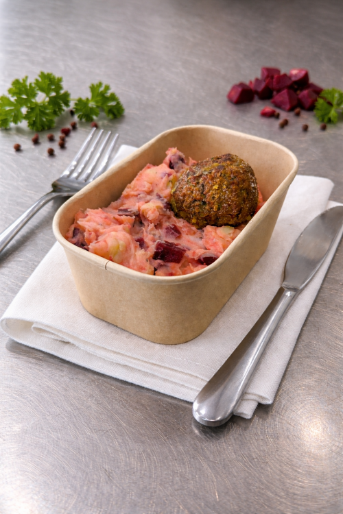 Smeuïge en smaakvolle stamppot met rode bietjes en een gehaktbal.