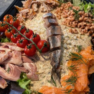 Rijkelijk opgemaakte zalmsalade gegarneerd met diverse vis en garneringen (ca....